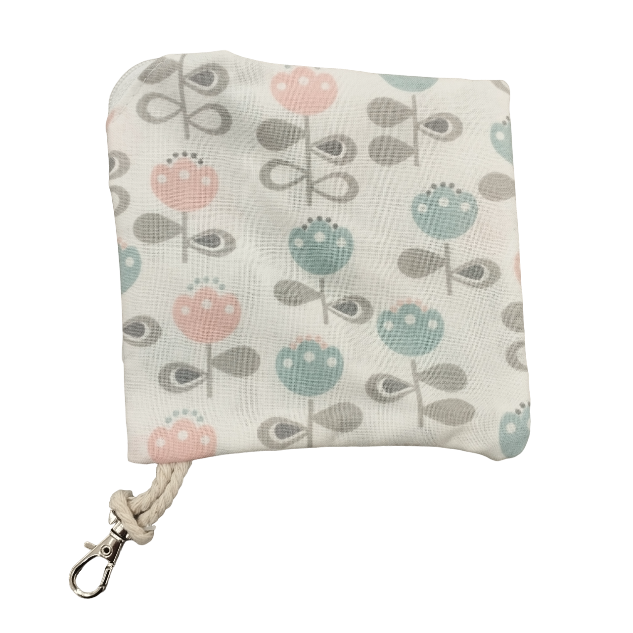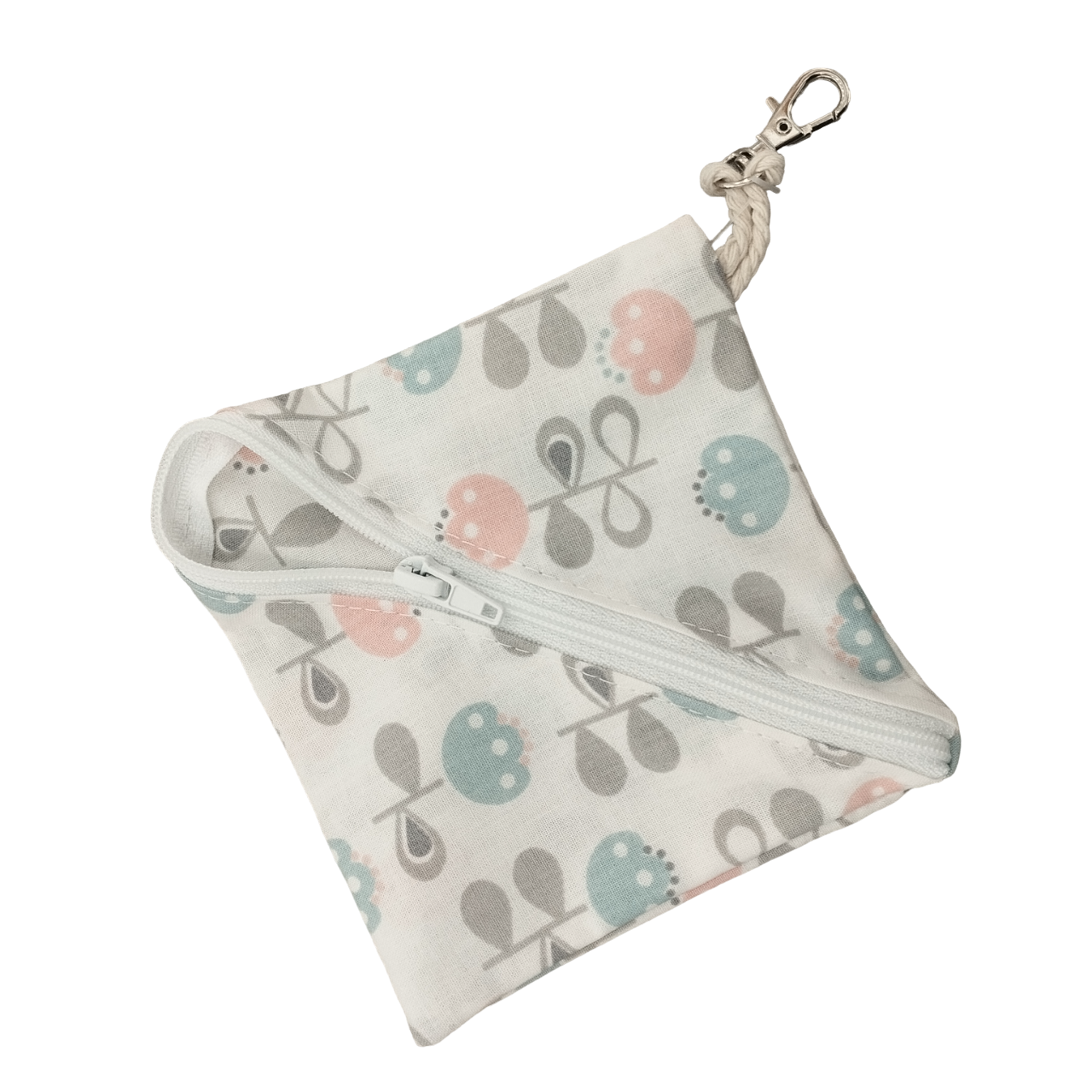 Notre porte tétine est conçu en 100% coton avec le motif fleurs roses et bleues.